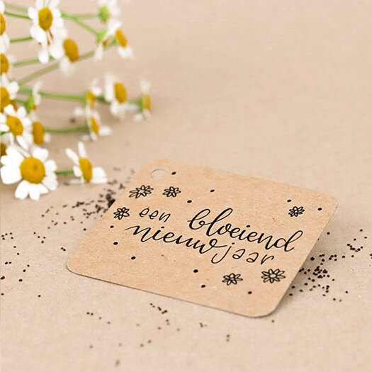 Een kraftlabel met daarop 'Een bloeiend nieuwjaar'. De afmeting is 50x60 mm. Rechtsboven zit een boorgat, dit is ideaal om de label te bevestigen aan bijvoorbeeld je zelf gemaakte presentje.